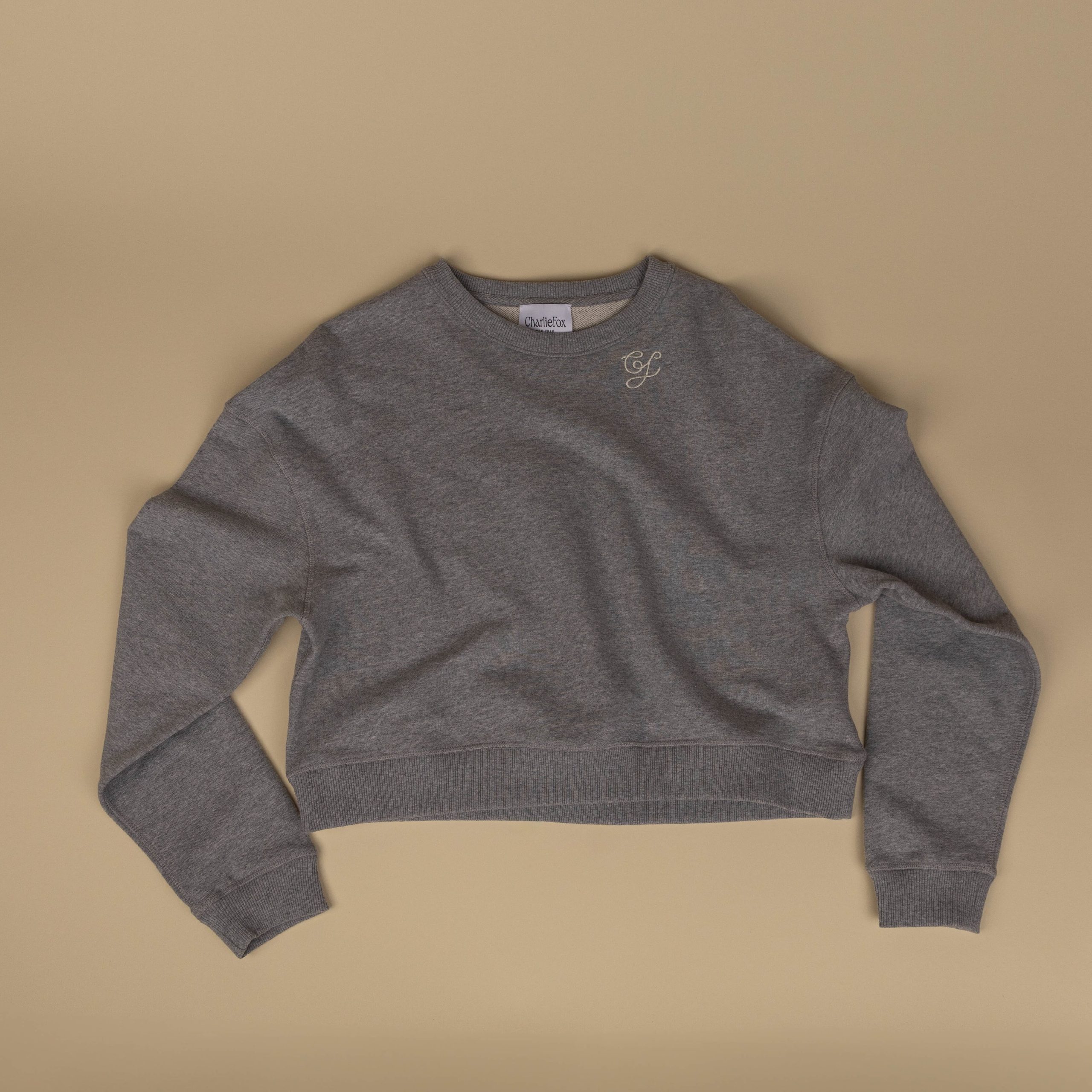 This Heather grey crew neck sweatshirt is 100% cotton. Choose between a sand or cream CF embroidery, hand-sewn in New York. One size.