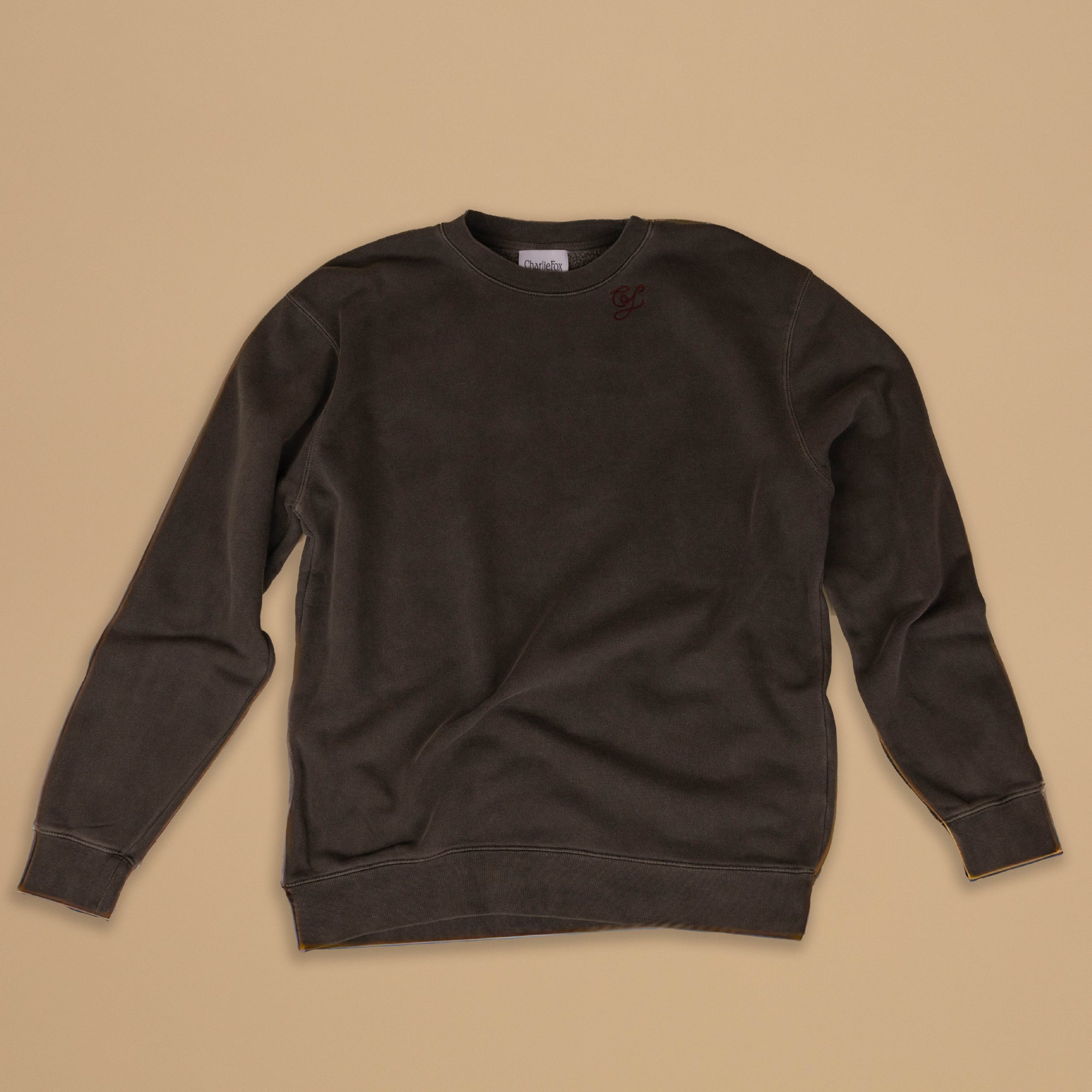 This midnight grey crew neck sweatshirt is the perfect classic fit for men and cozy oversized look for women. Choose between a sand or cream CF embroidery, hand-sewn in New York. Available in sizes M & L.
